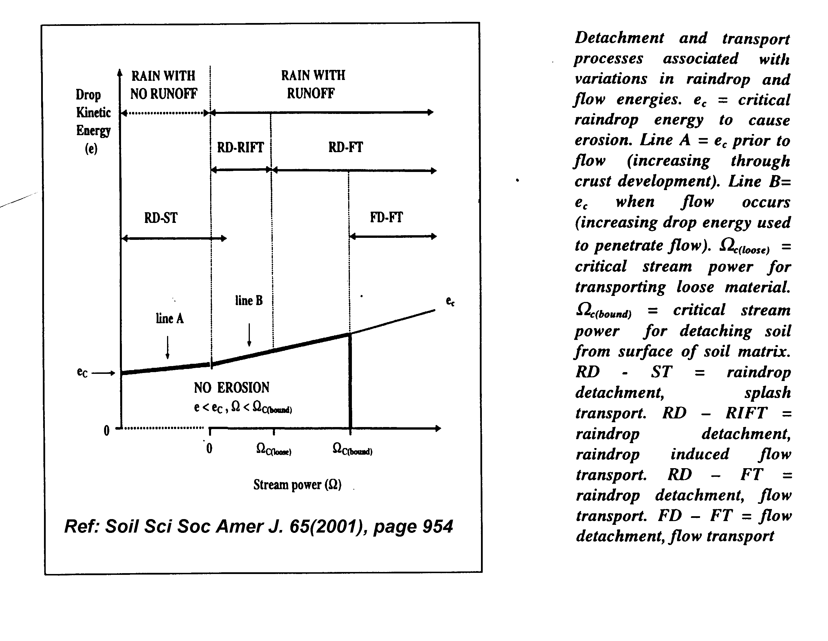 As runoff moves downhill, it is at first a thin diffuse film of water which has lost virtually all the kinetic energy which it possessed as falling rain. Thus it moves only slowly, has a low flow power, and is generally incapable of detaching or transporting soil particles.